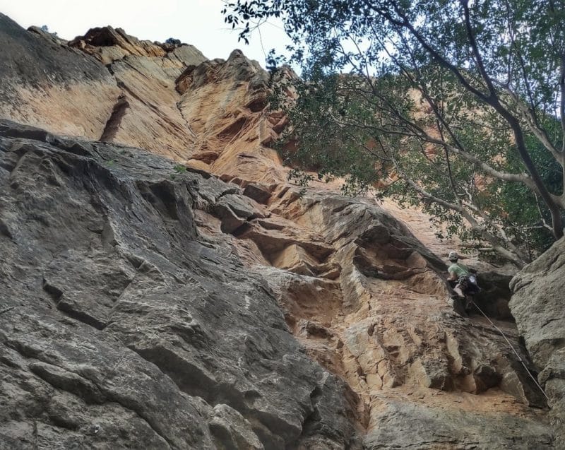Cuenta Hippie: «Ese primer largo tenía solo 5 seguros tipo Spit hiper oxidados en 40 metros de placa naranja. Mi impresión es que alguien pasó por allí y quiso abrir una vía, metió cinco chapas y se volvió a casa.